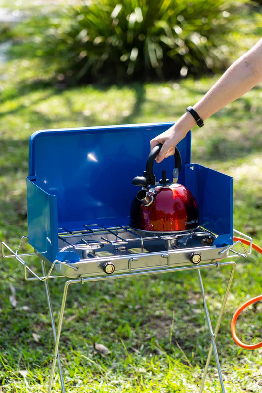The Companion Winged Stove Stand offers a sturdy base for most 2-3 burner stoves, ensuring a safe cooking setup for you, your family, and friends. Designed with winged ends, it keeps your stove secure and prevents any sliding, while the lower shelf provides handy storage space for utensils or cookware. For added convenience, the stand folds flat, making it easy to store and transport wherever your adventures take you!