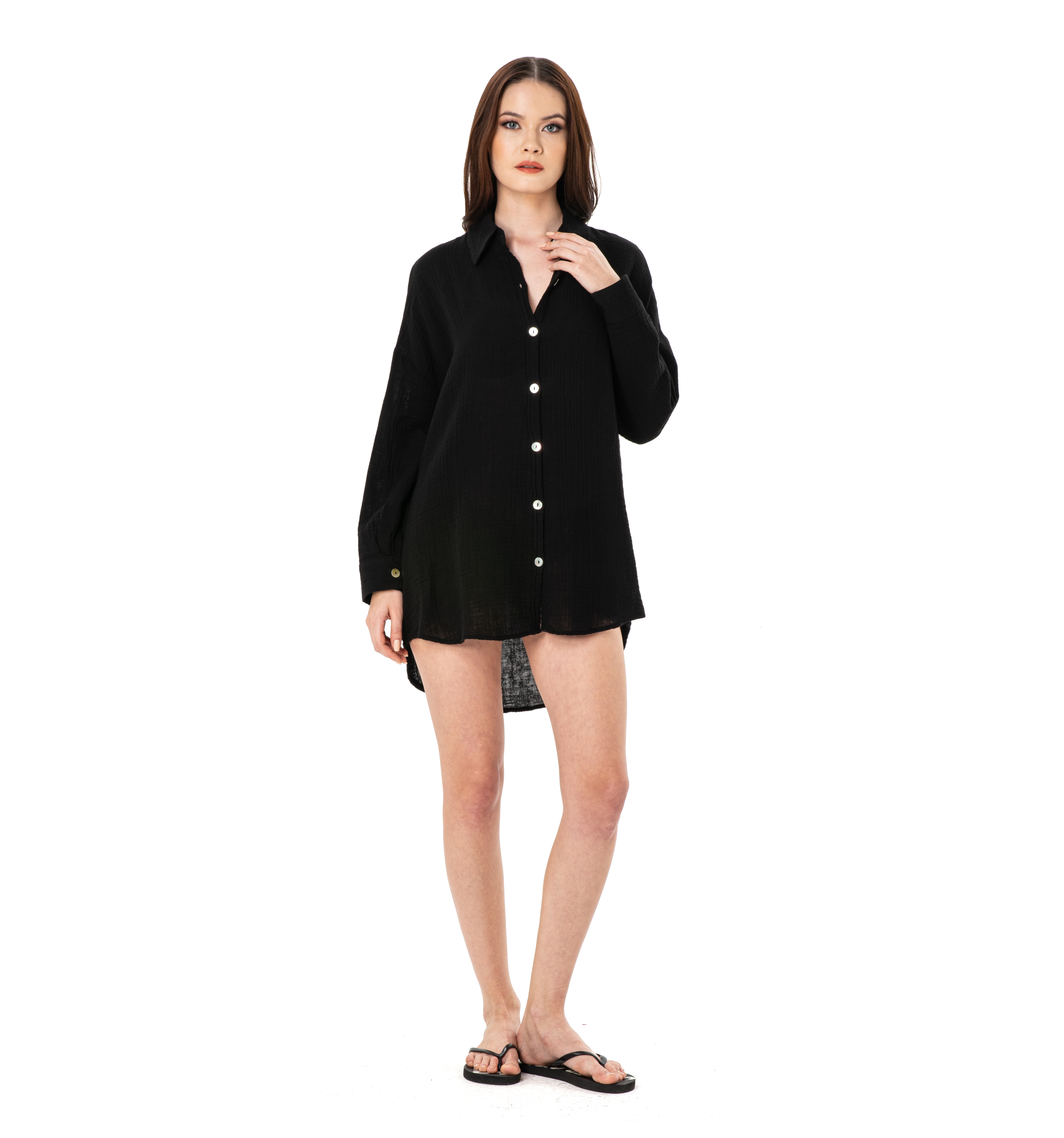 Just like a borrowed boyfriend’s dress shirt, this shirt tunic offers the wearer an easy-going fit and a lightweight texture you’ll want to live in. Featuring a classic button-up collared silhouette, this crisp black shirt is made from 100% cotton material that stays fresh and comfortable all day. This sheer cotton shirt would make the perfect beach cover-up and can be styled into many fashionable looks.