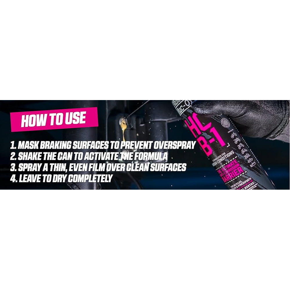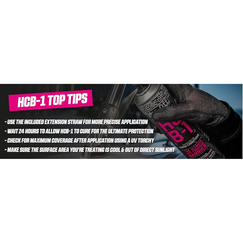 Protecting your bike from the elements has never been easier with Muc-Off HCB-1. This advanced spray forms a cutting-edge, thin film barrier that locks out moisture and road salt, making it perfect for those who ride through harsh winters or unpredictable weather. The formula actively halts existing rust in its tracks and helps eliminate it, ensuring your bike’s frame, chain, metal parts, plastics, and paintwork stay in top shape all year long. By penetrating even the smallest cracks and seams to drive out water and contaminants, this solution delivers robust defense where it's needed most. Ideal for bicycles, ebikes, or motorcycles—whether you’re storing your ride until spring or braving daily commutes—HCB-1 offers peace of mind against corrosion while allowing you to verify complete coverage using a UV torch thanks to its innovative application dye.